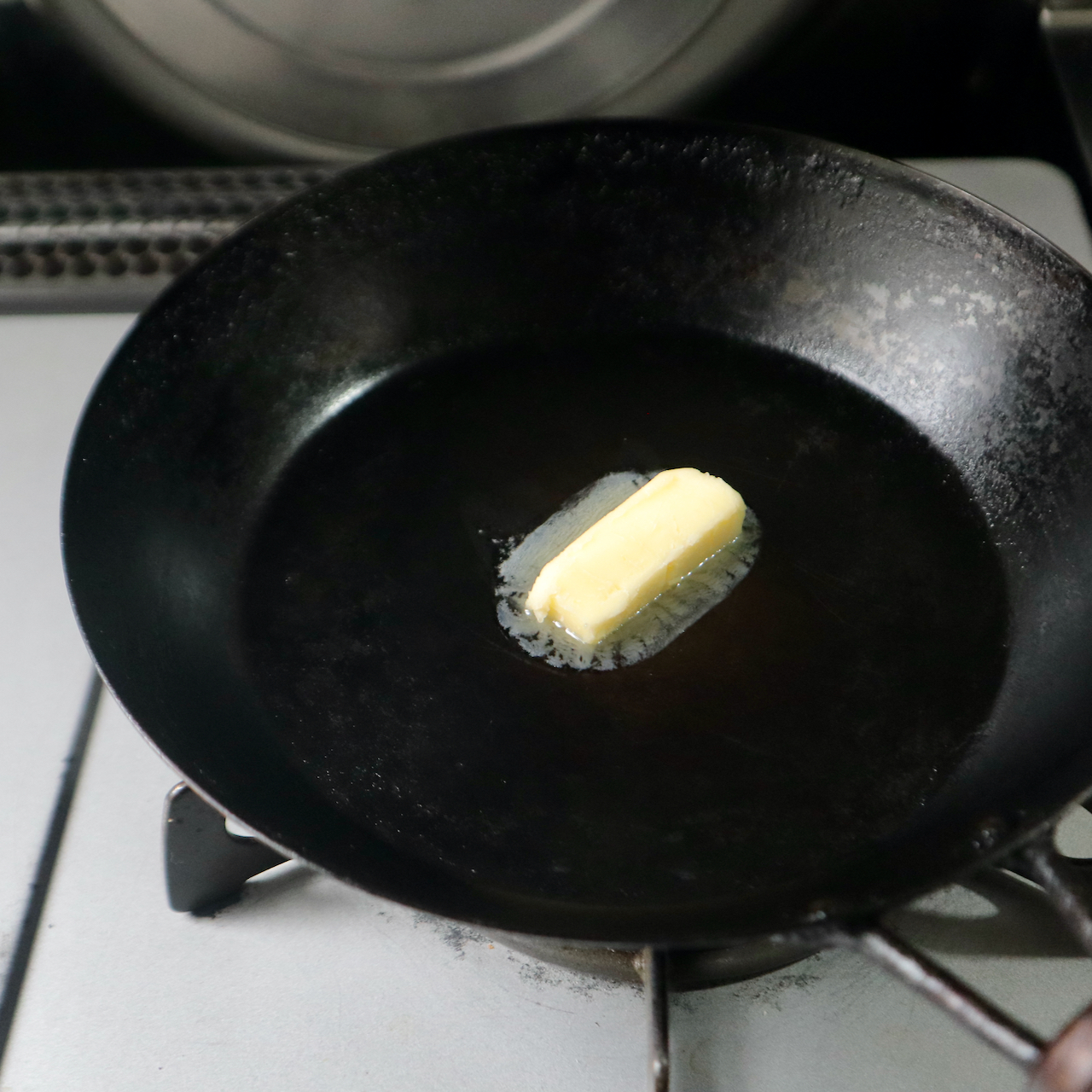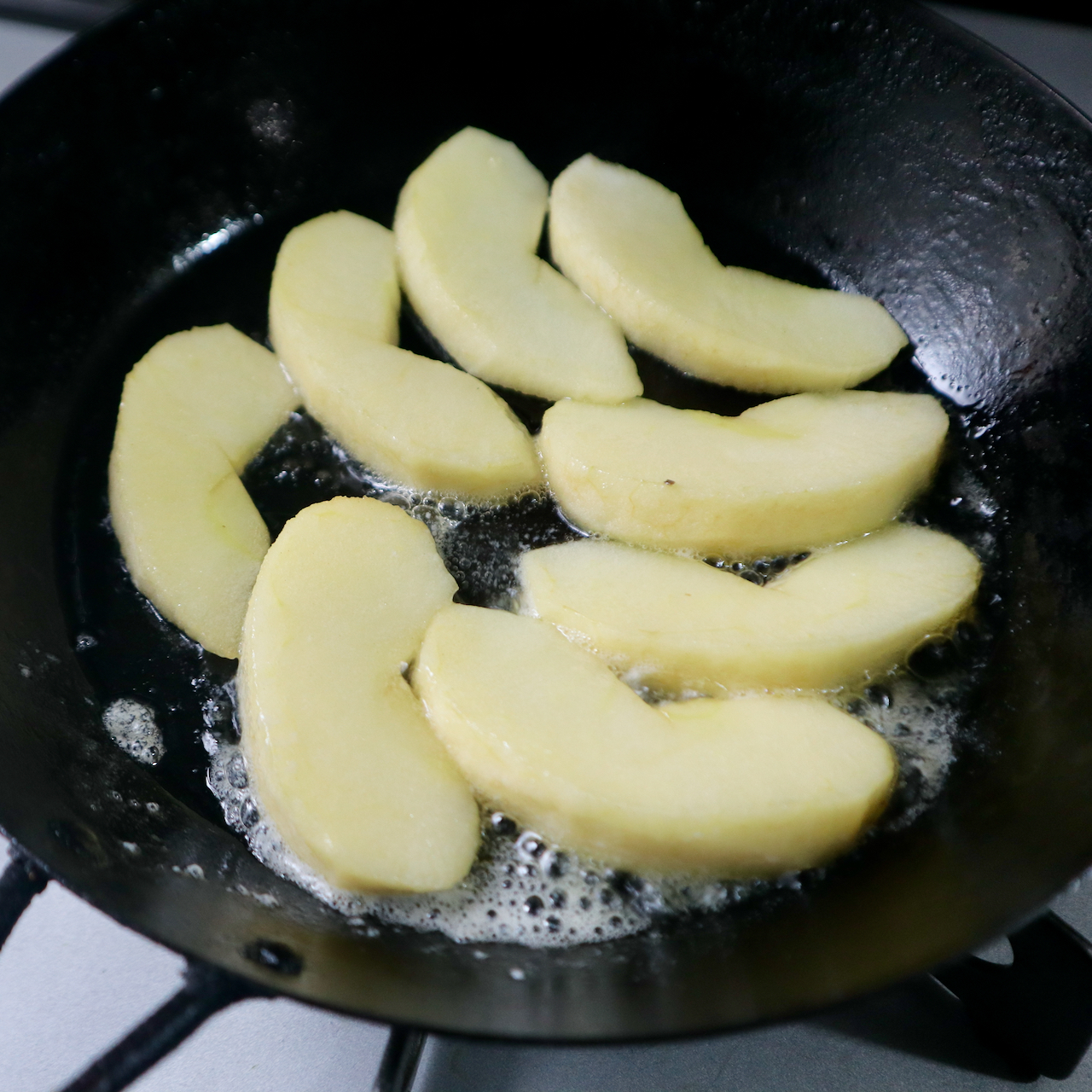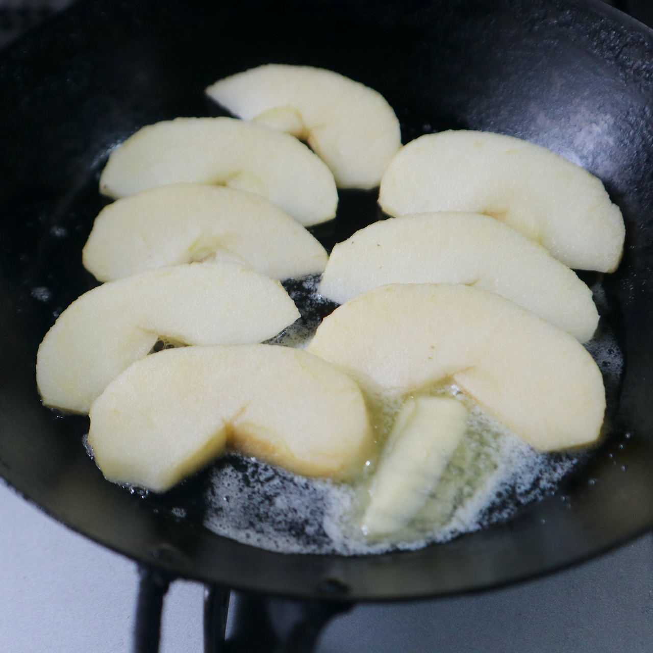 ② バターをフライパンに入れ、りんごを並べて焼く。ひっくり返して再度焼く。焼き加減はお好みです。私はシャキッとさが残った方がいいので、バターがりんごにしみて、少し色が変わったぐらいであげます。