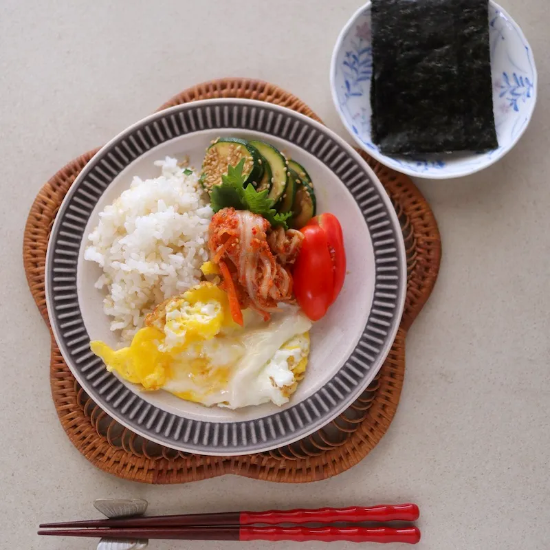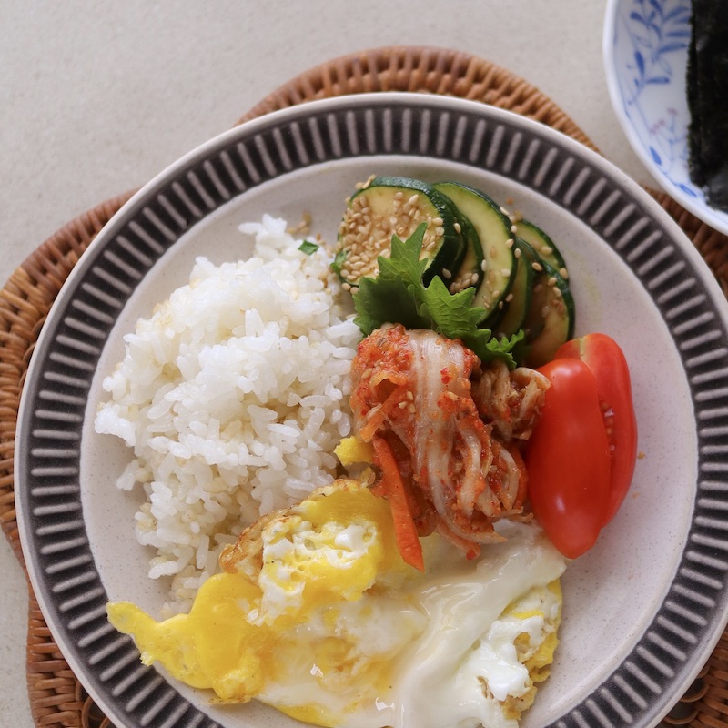 キムチを食べているけれど朝ごはんなので笑、簡単に卵を焼いて、キムチを乗せて。ズッキーニのナムルは前夜あえて多めに作ったもので、それを添えました。