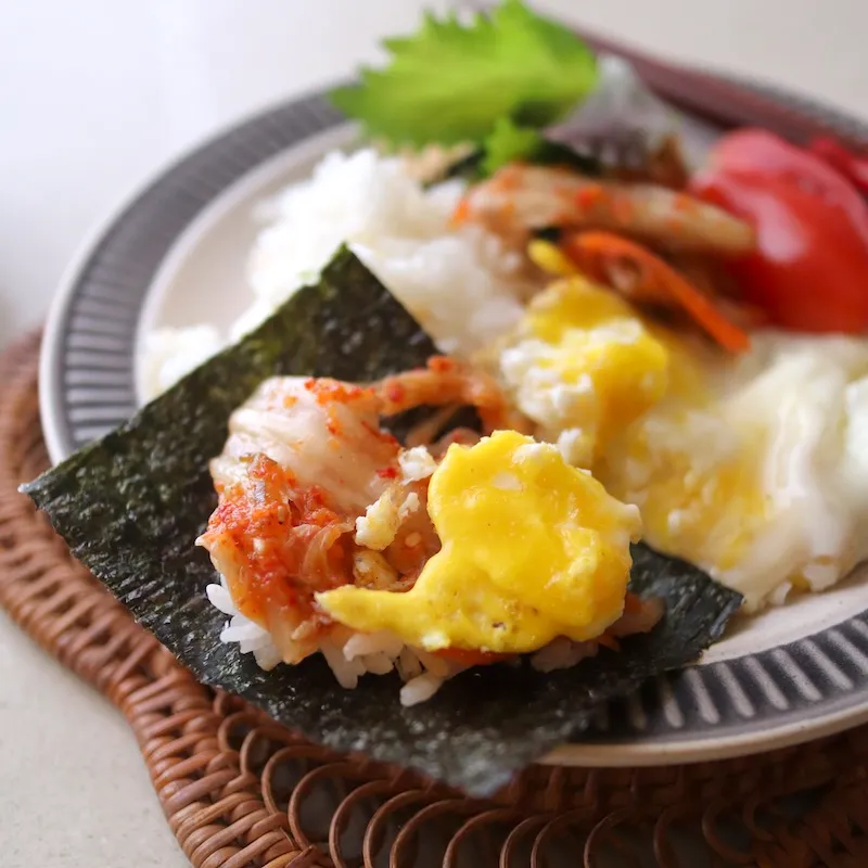 途中で登場したこちらは、最近の私のごはん。お友達にいただいた手作りキムチがとっても美味しかったので、その味を堪能すべく手巻き風にした日。