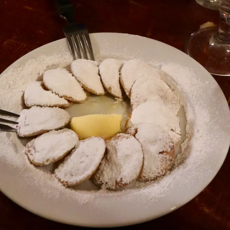 ポファチェスはオランダの伝統的なミニパンケーキ。バターと粉砂糖がたっぷりかかってます。