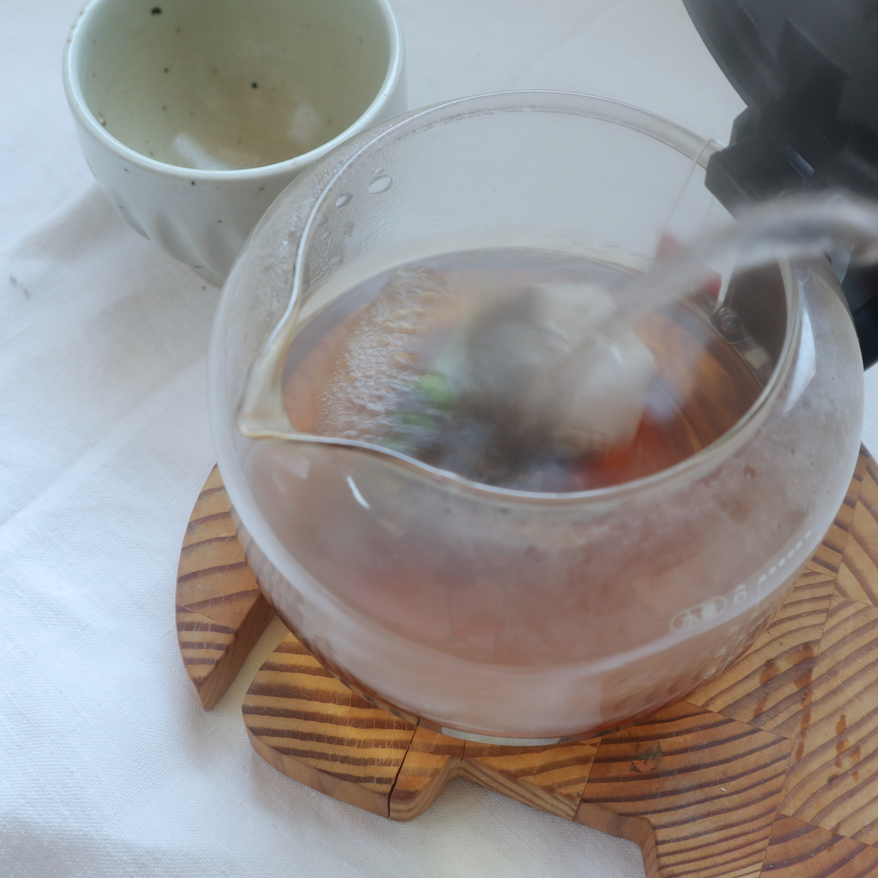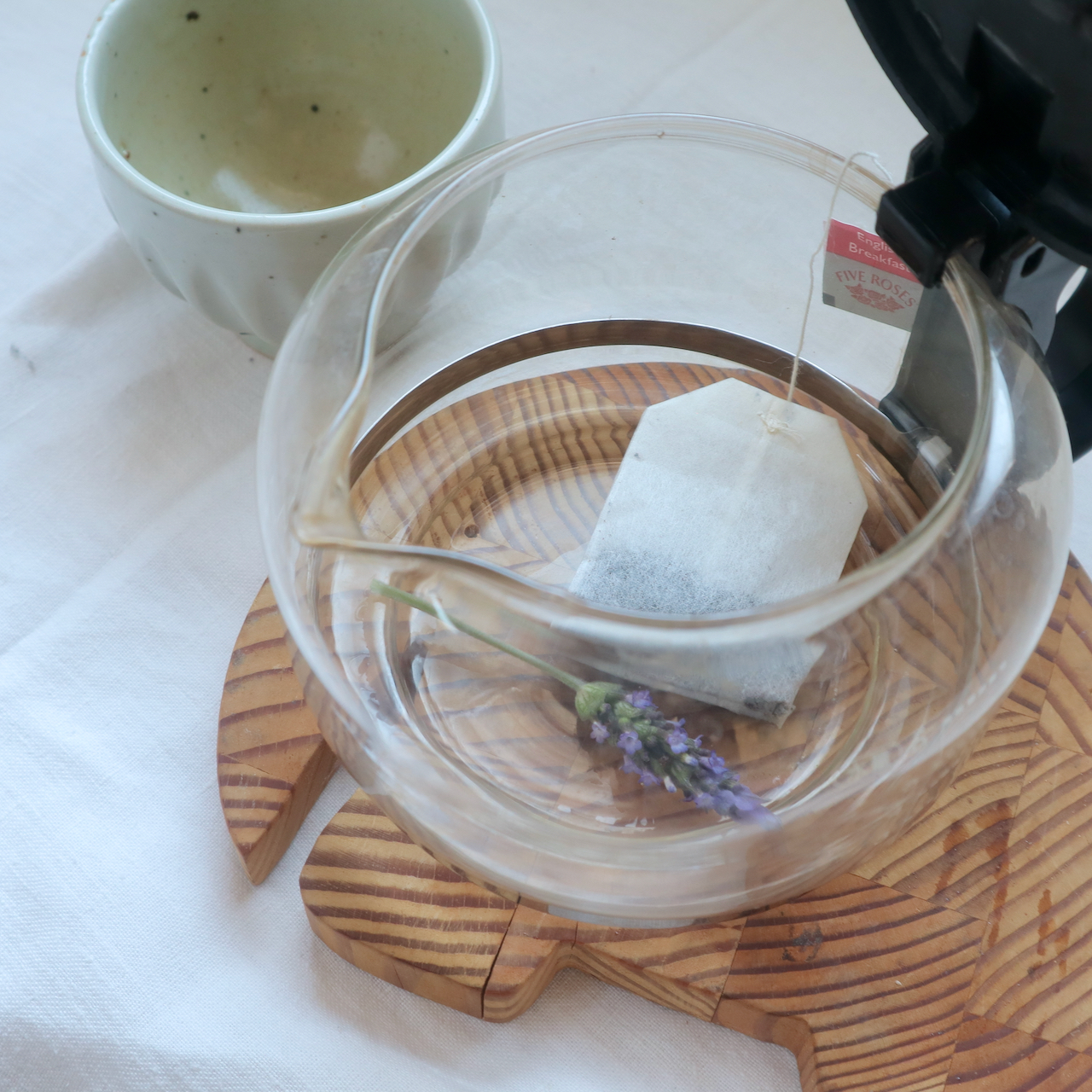 ① ポットに、ティバッグとラベンダーを入れる。よくわかしたお湯を入れる。