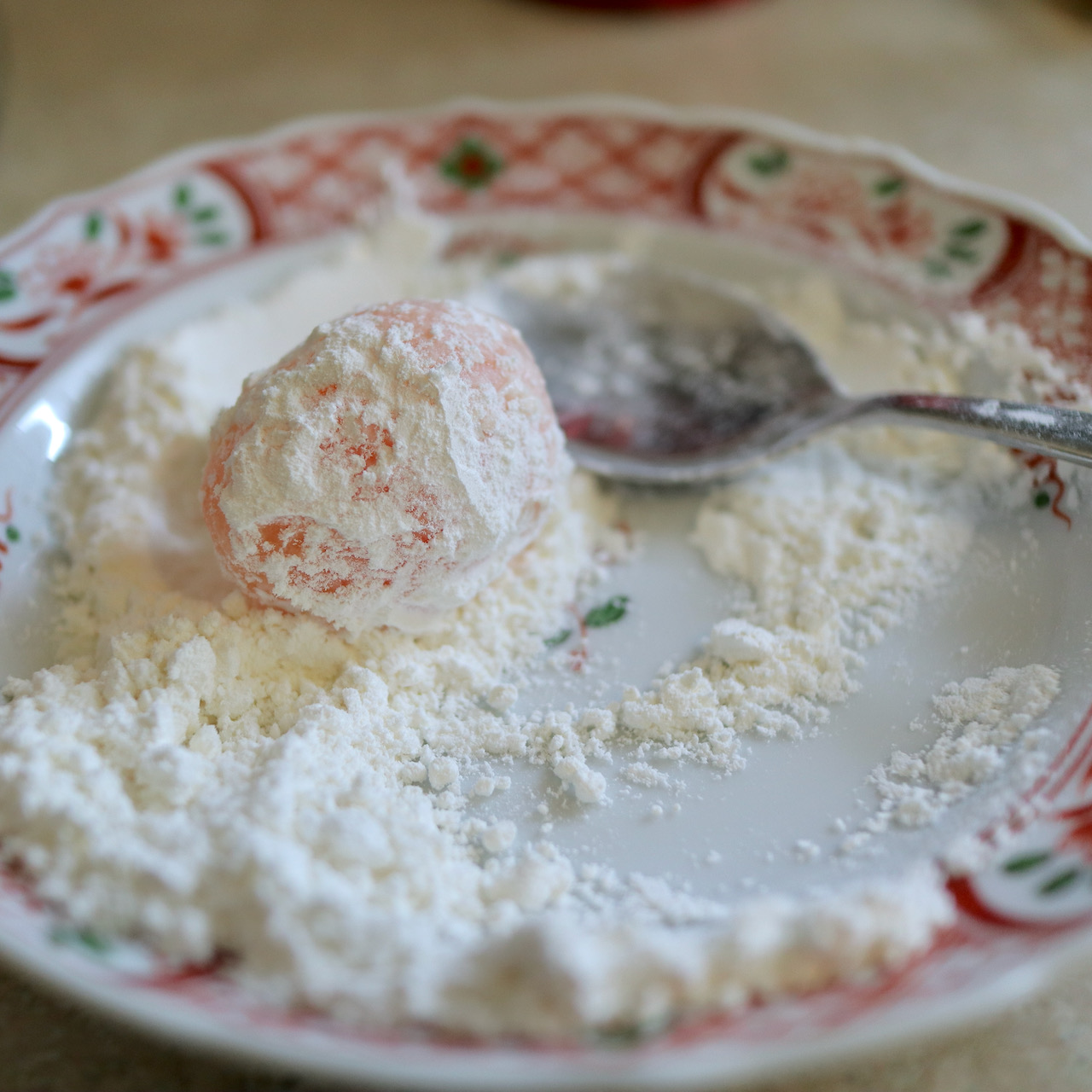 水気のあるたまごの黄身に厚めの衣をつけるのは、難しい。特に白身が残っていると下地となる小麦粉がうまくつきません。軽い衣が付く程度と思って作った方が、いい。