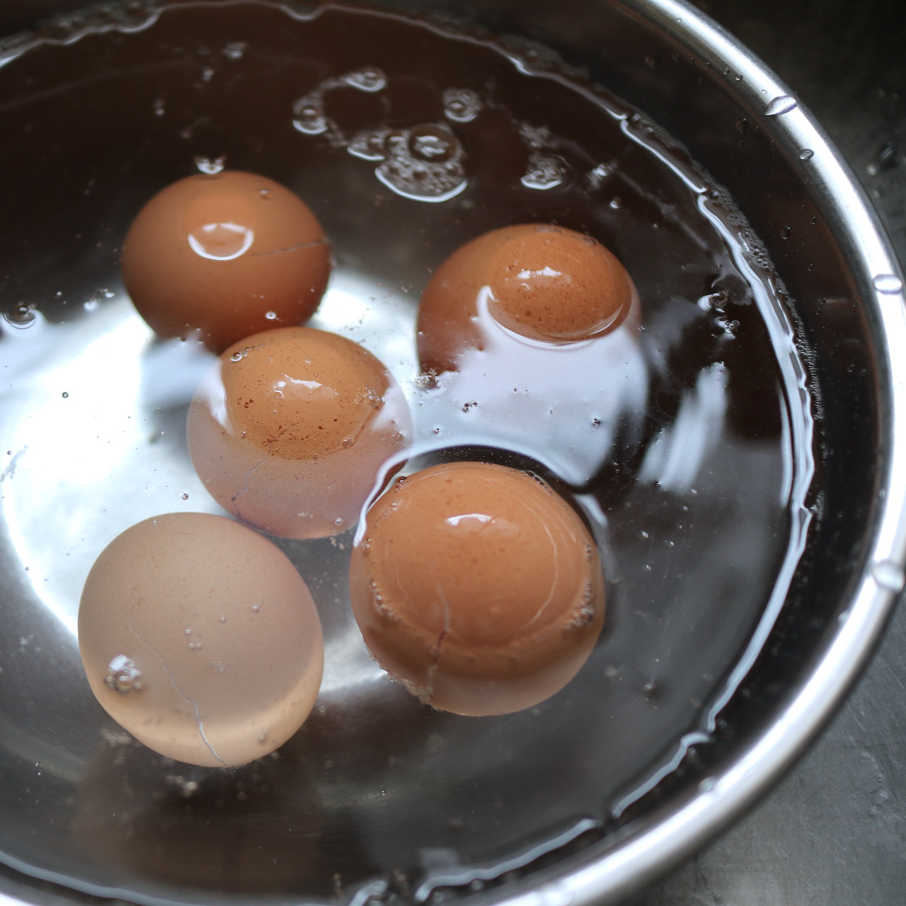 ① 冷凍した卵を解凍せず水につけ、殻を剥く。
