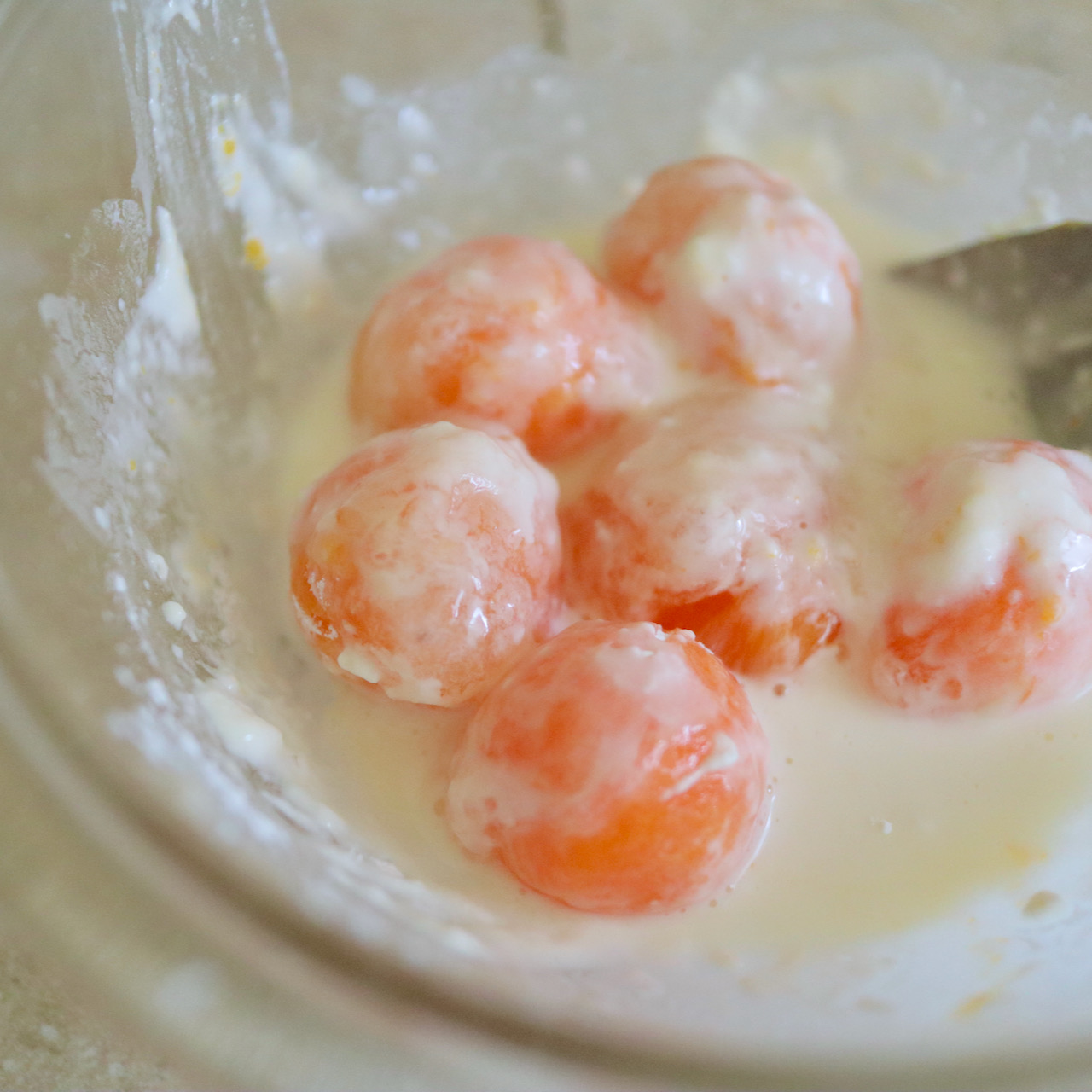 写真だと凍った白身が少し残っていますが、綺麗に取れた方が後々揚げやすくなります。が、黄身の解凍しすぎは厳禁なので、白身の残り具合と黄身の解凍具合のバランスを見て、ほどほどで。