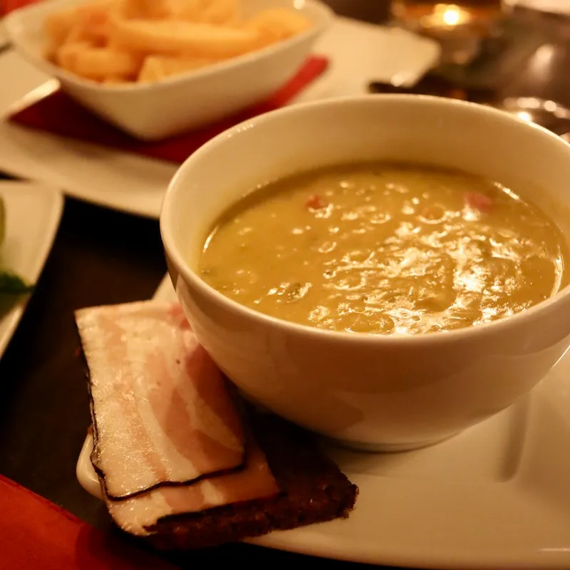 乾燥したえんどう豆、じゃがいも、玉ねぎ、豚肉/ソーセージなどを加えて豆がとろとろになるまで煮込んで作り、ライ麦パンにスモークベーコンを添えていただきます。