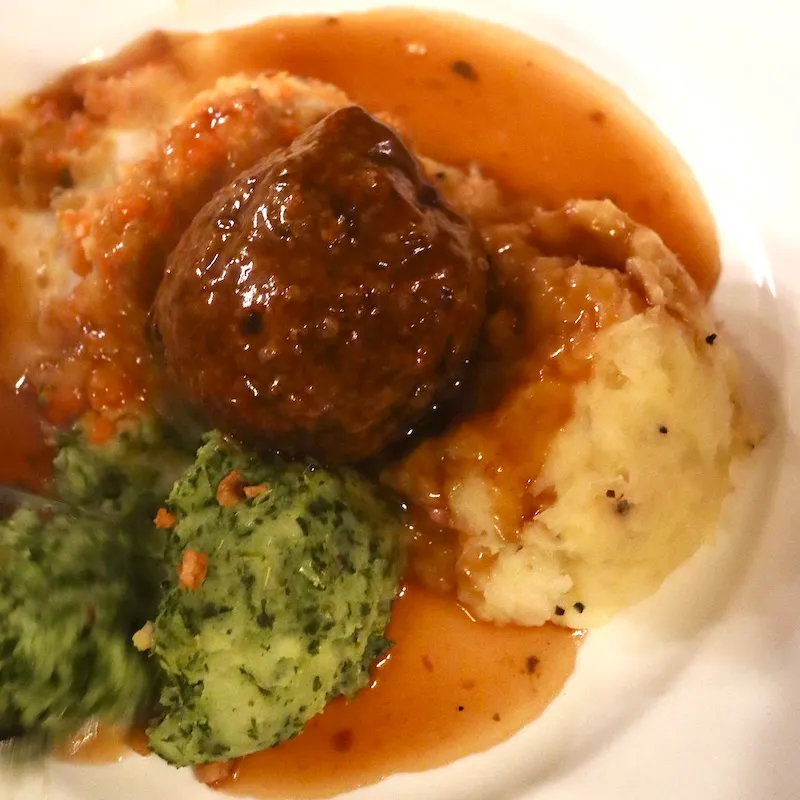 ソーセージとミートボールの下に敷かれているマッシュポテトのようなものは、ジャガイモと野菜を潰したオランダの家庭料理 Hutspot(ヒュッツポット)とその仲間。