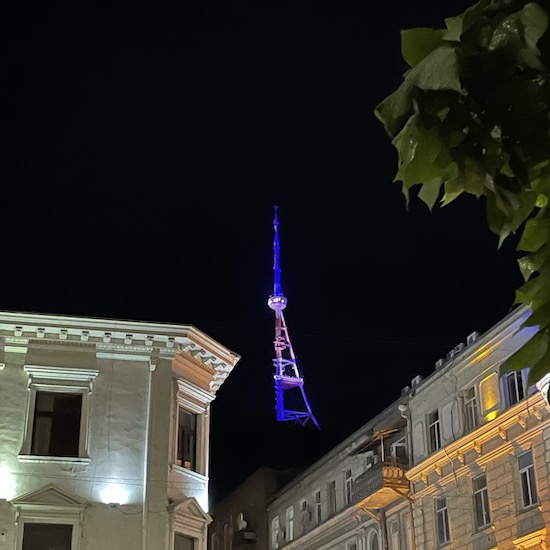 夜はライトアップされていたトビリシタワー。東京タワーのように1日同じ色のライトアップではなく、くるくると周期的にライトアップの色が変わっていました。