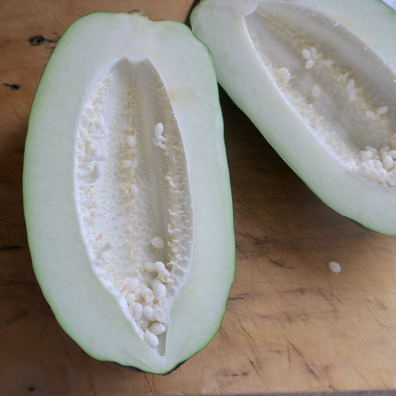 (青)パパイヤの中には種がたくさん入っているので、包丁を入れたあと、まずは種とワタを処理します。しっかりしたスプーンなどで、こそげるように種と綿をとっていきます。