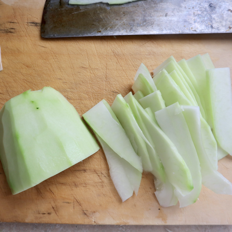 皮を剥いたパパイヤを、調理目的にあった大きさに切ります。この日はソムタムを作ったので、千切りでした。