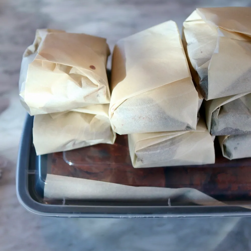 いつもならラッピングも何もなく、できたお菓子はそのまま胃に入るのが常ですが、一緒にブラウニーを作ったお友達がワックスペーパーを用意してくれたので、ブラウニーをひとつひとつ包んで持ち帰りました。
