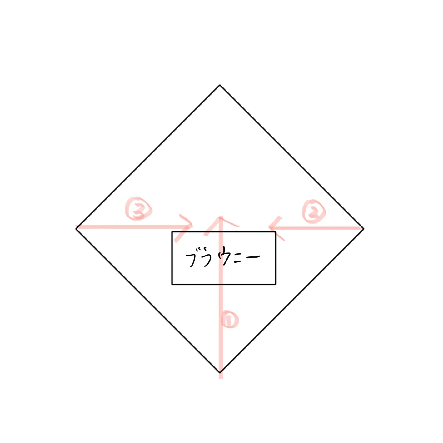 ブラウニーは、ワックスペーパーで上の図の要領で(わかるでしょうか?一番簡単な包み方です)包みました。最後に残る端(写真上側)は、折り目に入れ込みます。