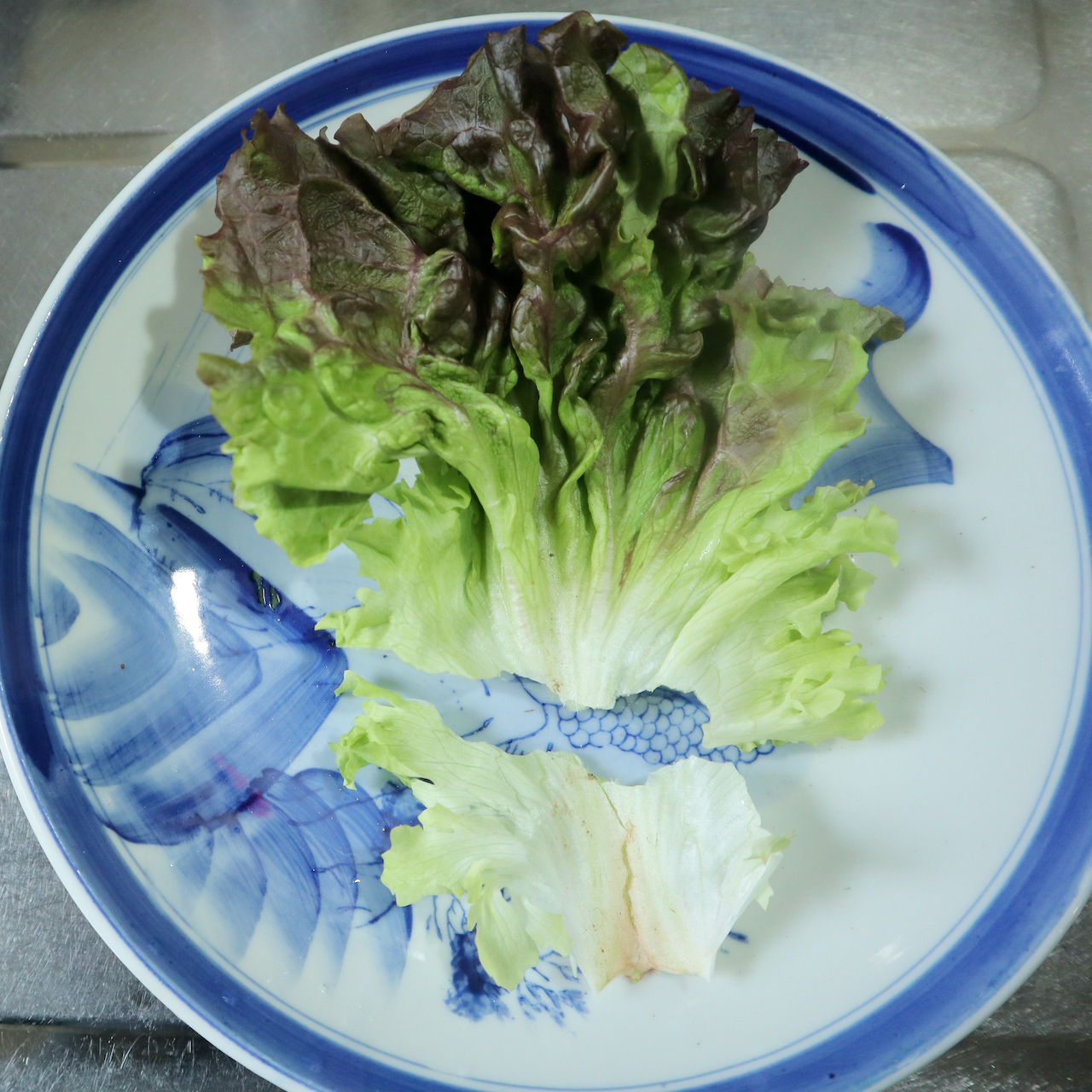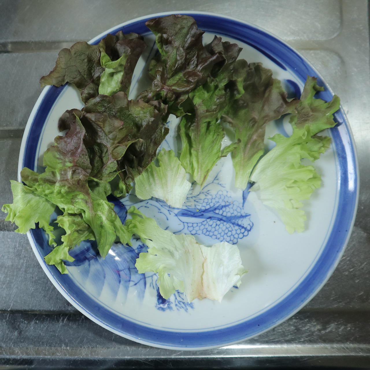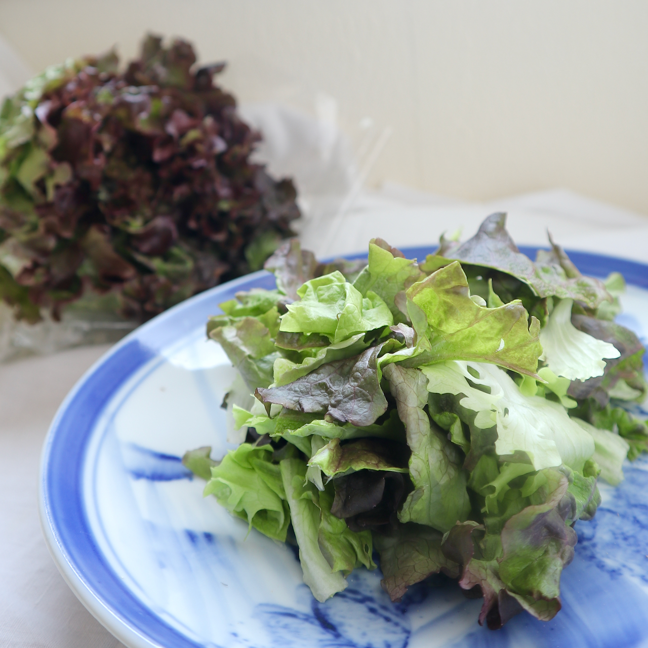 レッドリーフの葉は張りがなく、水分が多く残っていれば潰れてしまう柔らさ。この柔らかさが食べやすくてよく買う理由とはいえ、この柔らかさゆえ、レッドリーフのふりふりした可愛さはお皿の上でつぶれがちになるを、ずっと残念に思っていました。