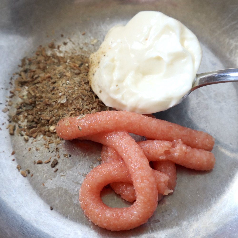 ②たらこ、マヨネーズ、出汁パックの中身を入れ、よく混ぜる。普通のたらこや明太子を使う場合は、薄皮から中の卵を出して使う。