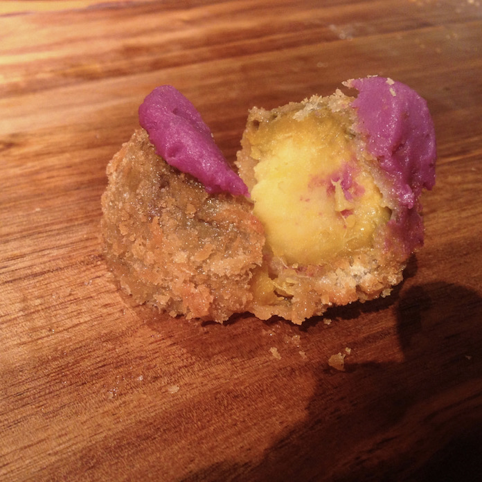 お箸で割ると、中の黄色と紫のコントラストが目にも鮮やか!というのが写しきれない私のカメラの腕なのなさですが。本当に色が美しかった!