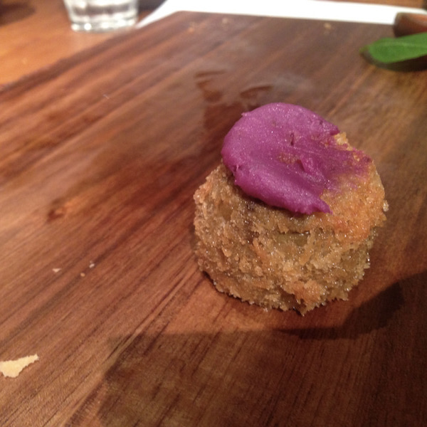 コロッケの上に紫芋のマッシュを上に乗せたのは、食べる時の楽しみを意識して。
