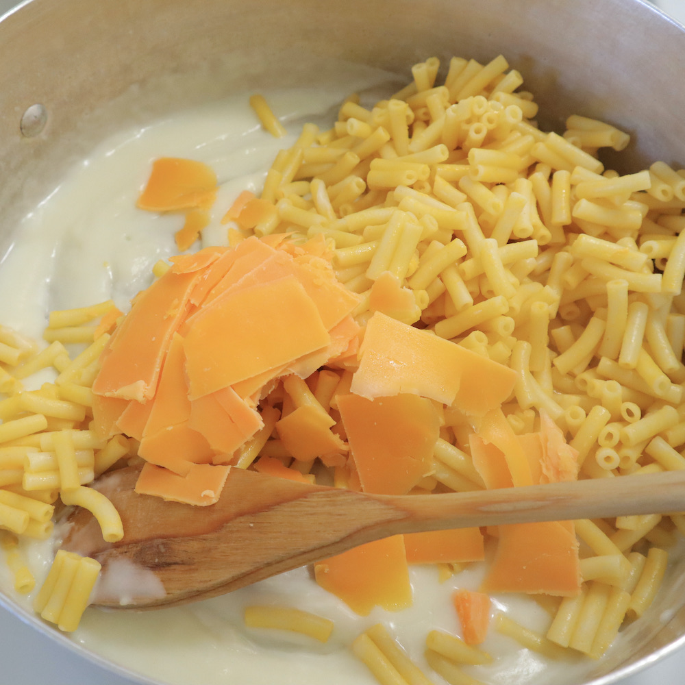ベシャメルソースを作る要領で、お鍋にバターを入れて溶かし、小麦を加え炒める。牛乳を加え、混ぜながら炒める。ソースがもったりとしてきたら、マカロニ&チーズとチーズを入れて混ぜる。