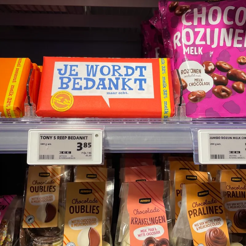 オランダと言えばの、私が大好きな!奴隷解放を目指すチョコレートTony’s Chocolonely (トニーズ チョコロンリー)。(→ 全てのチョコから児童・奴隷労働をなくすためのチョコレート
