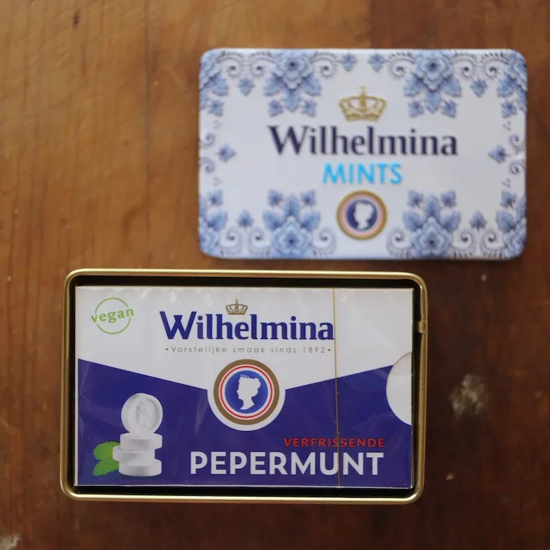 右のウィルヘミナ・ペパーミントは、ミントタブレット。なんと1892年から作られているタブレットでオランダ王室御用達。入れ物が色々あるそうで、家族はこの缶に惹かれて購入していました。