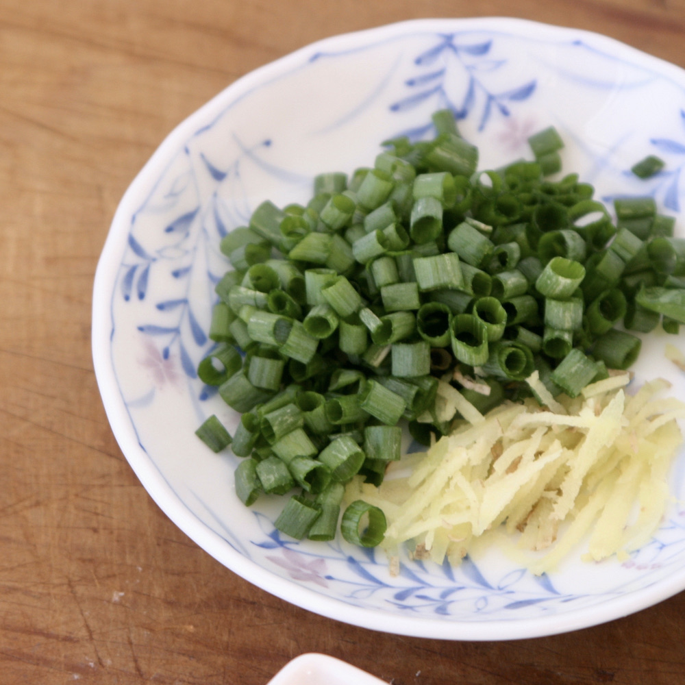 ある日は、ねぎ(わけぎ・あさつき)と小籠包の針生姜のイメージの生姜の千切り。