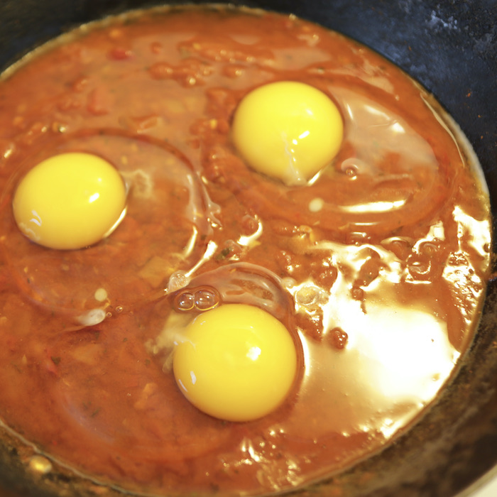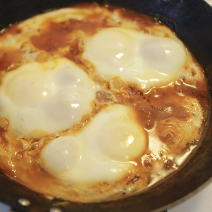 シャクシュカは、北アフリカ(モロッコ・チュニジア・アルジェリア)発祥のトマトソースに卵を落として焼いた料理。