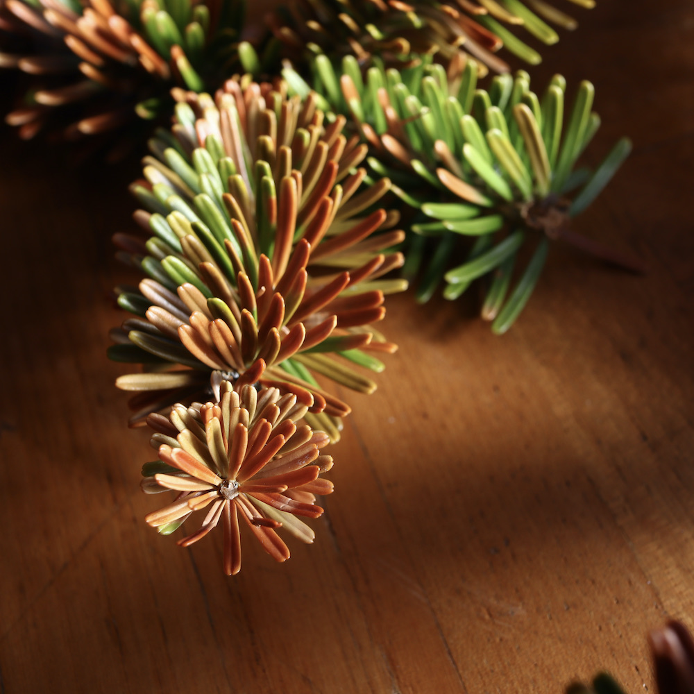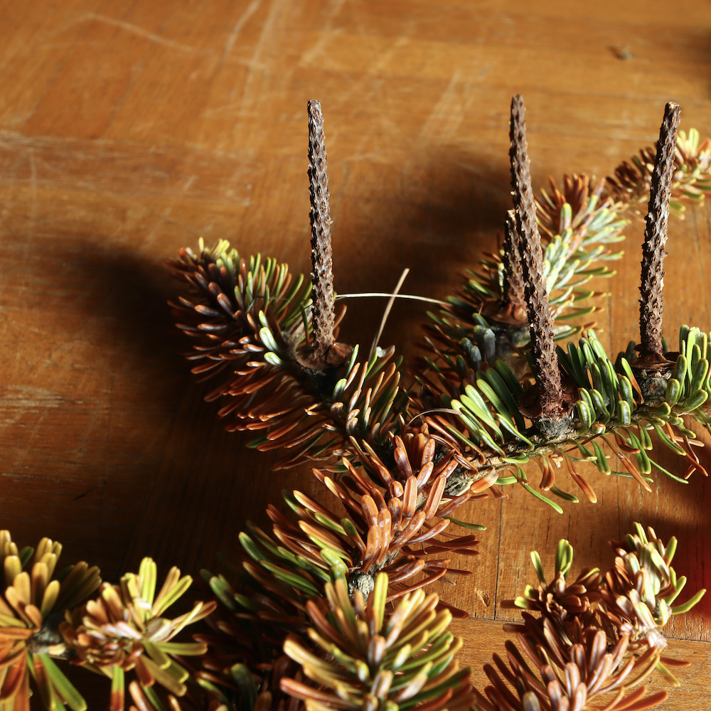 トレジョさんのルームスプレーの下に敷いたのは、別荘へ冬支度をしに行った時、庭と近所からの拾い物。家族が切り株の上でその拾ってきた植物の写真を撮っていたので、家族をどけて写真を撮らせてもらいました。