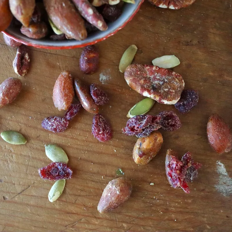 メープルローズマリーに赤&黒胡椒が加わったグレイズをまとったアーモンドとピーカンナッツ。甘いドライクランベリーとペピタスの4種類が混ざっています。