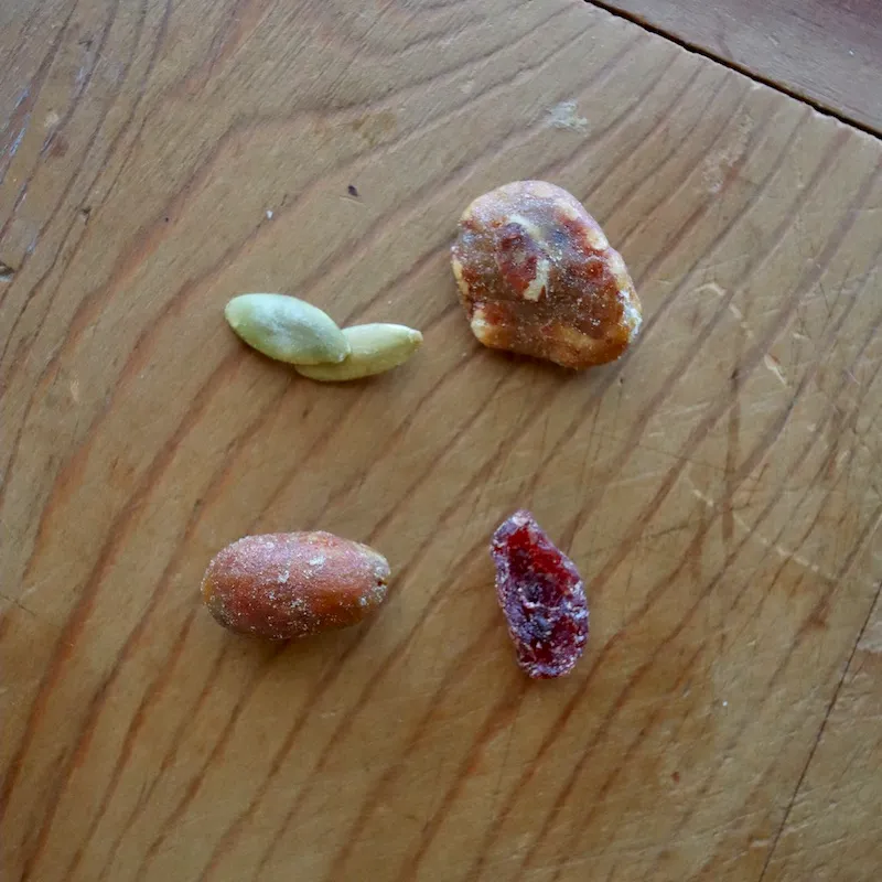 Trader Joe’s(トレーダージョーズ)のサイトによれば、ペピタスは歯応え要員だそうですが、アーモンドにかなり強めの、乾いたカリカリにも通じる食感があるので、その印象は弱め。