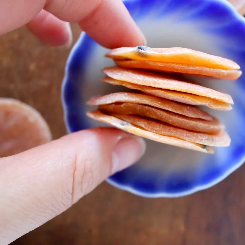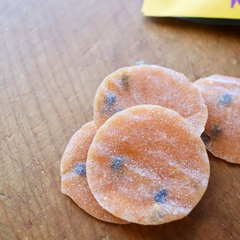 Passion Fruit Rounds(パッション フルーツ ラウンド)はドライフルーツではなく、果汁を固めたもの。グミのような弾力はないけれど、歯をったてるとムチっとした独特の食感がします。