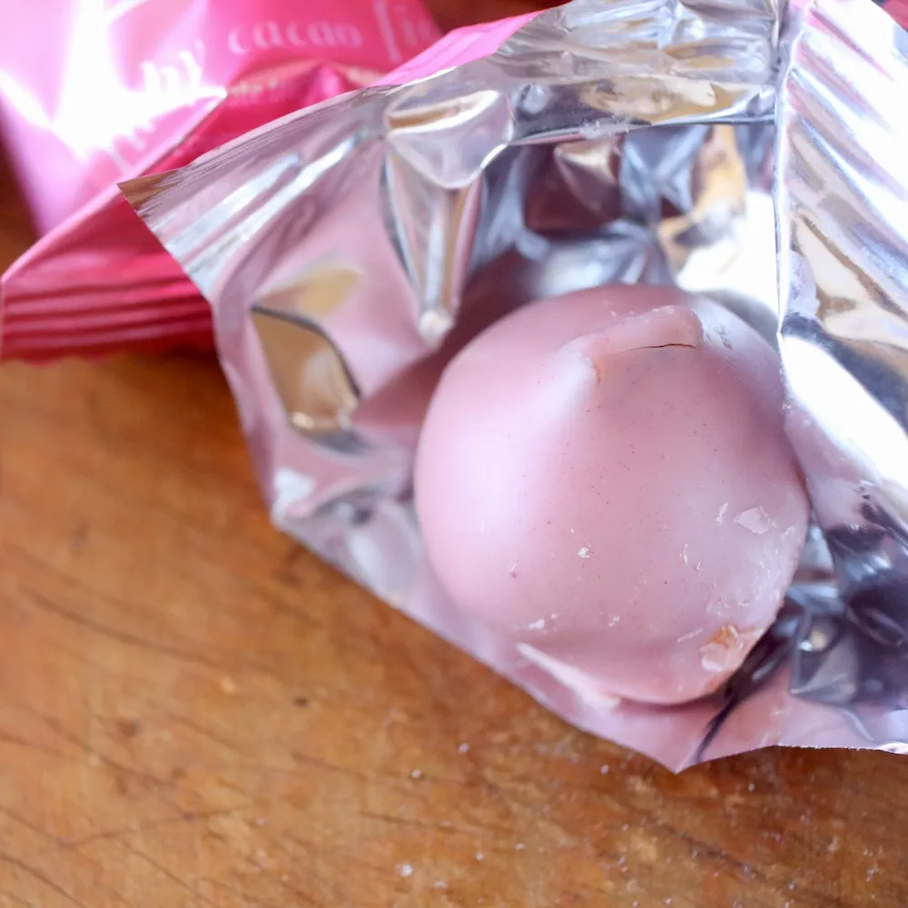 ルビーチョコレート味とあったからてっきり中のガナッシュにもルビーチョコレートが使われているのかと思ったら、ルビーチョコレートが使われていたのはコーティングのみ。